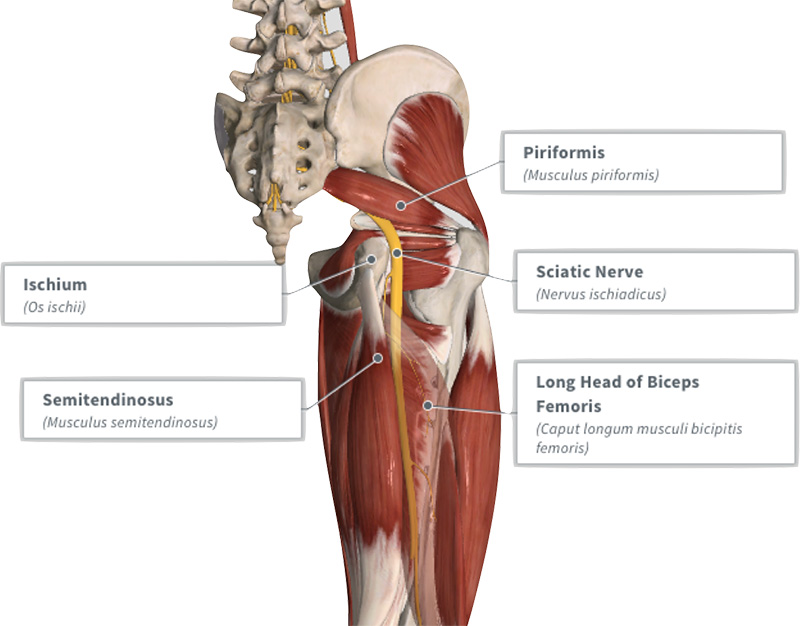 Sciatic nerve leaves the greater sciatic notch and emerges on the inferior aspect of the piriformis muscle. It crosses superficial to the small external rotators of the femur, lateral to the ischial tuberosity and deep to the hamstring muscles as it descends the thigh. In the superior aspect of the popliteal fossa it splits into the tibial and fibular nerves.